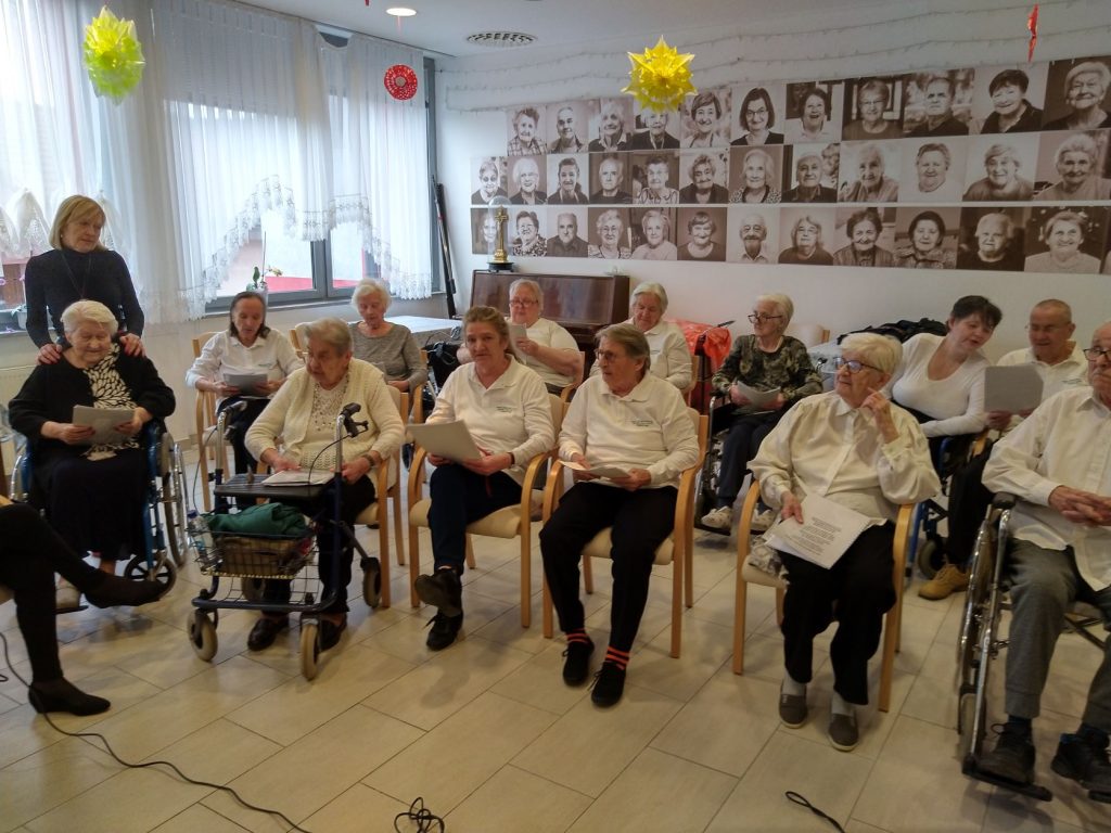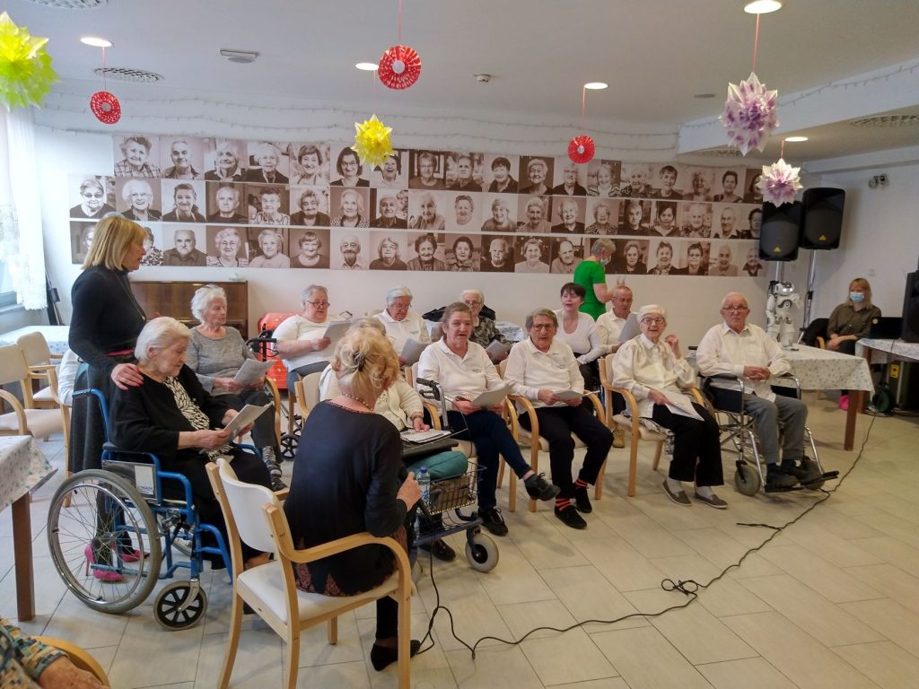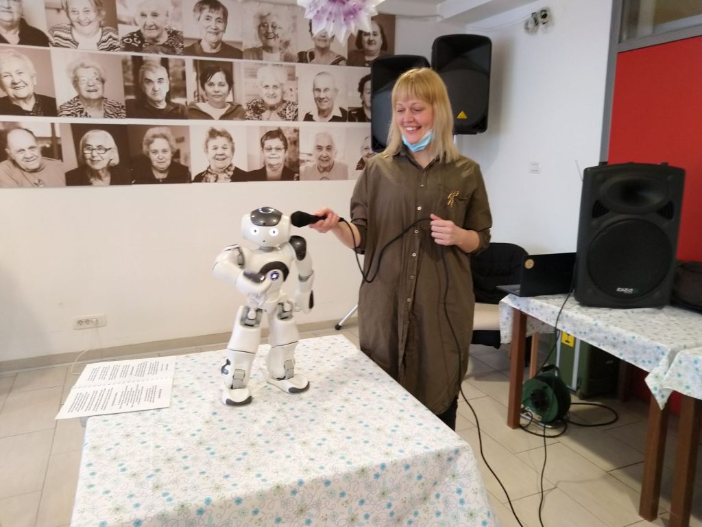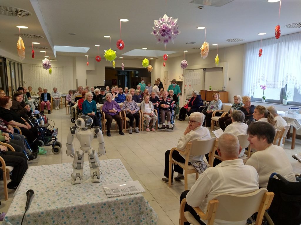 Domska glasbena skupina Nohšiht vsako sredo pridno vadi. Vodi jo gospa Lea Hlebec. Za današnje srečanje so pripravili pester pomladni program skupaj z humanoidno robotko Evo ter njeno mentorico dr. Mašo Mikkel Jazbec. Zapeli smo z robotko Evo