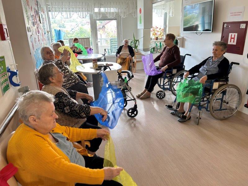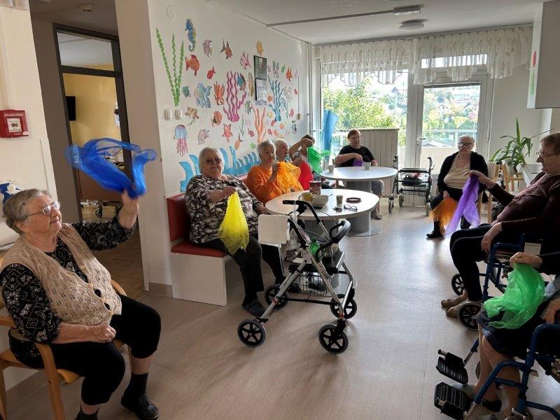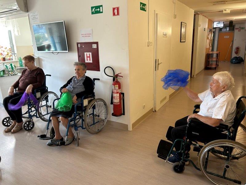 Telovadba z rutami je del aktivnosti vsakodnevnega urnika, namenjenega ohranjanju fizične kondicije in spodbujanju socialne interakcije med stanovalci.
