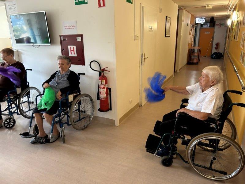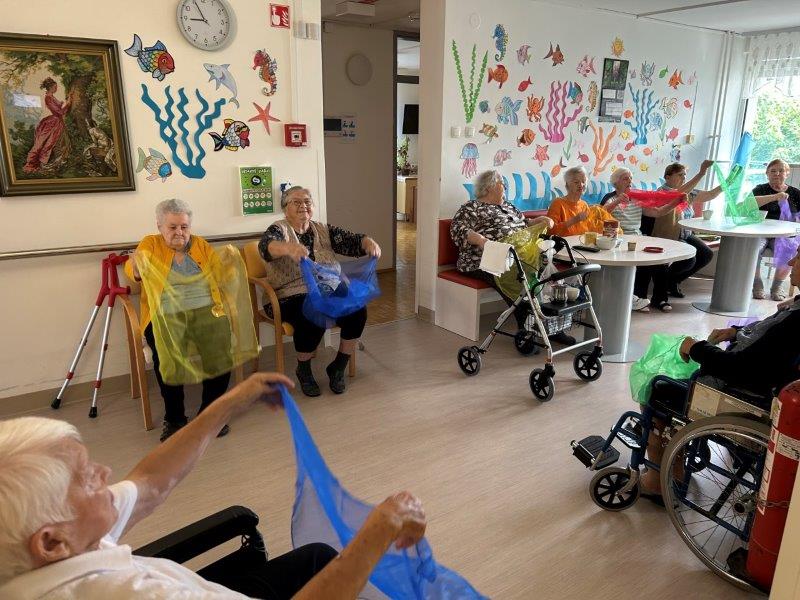 Telovadba je bila prilagojena sposobnostim in potrebam stanovalcev. Najprej smo se nežno ogreli, nato so stanovalci prevzeli rute, ki so jih držali v rokah, medtem ko so izvajali različne vaje za krepitev mišic in izboljšanje gibljivosti. Uporaba rut je bila odličen način za krepitev rok in spodbujanje koordinacije.