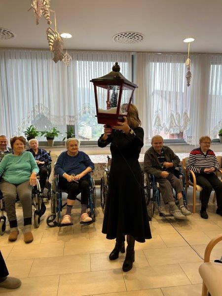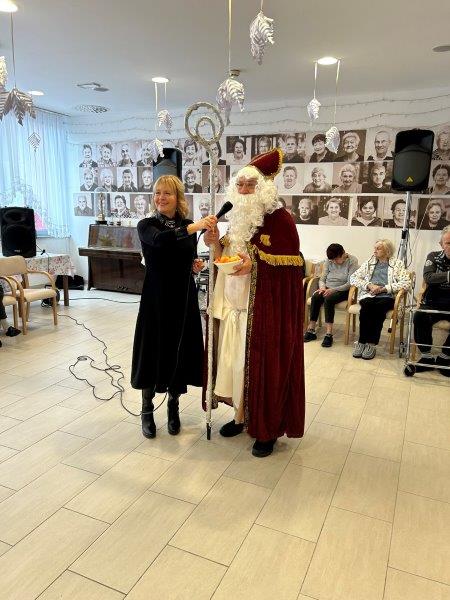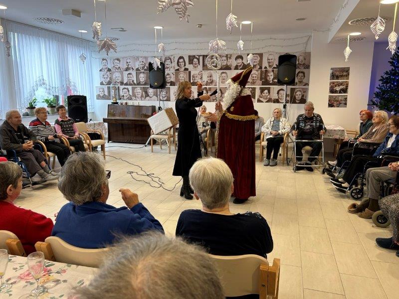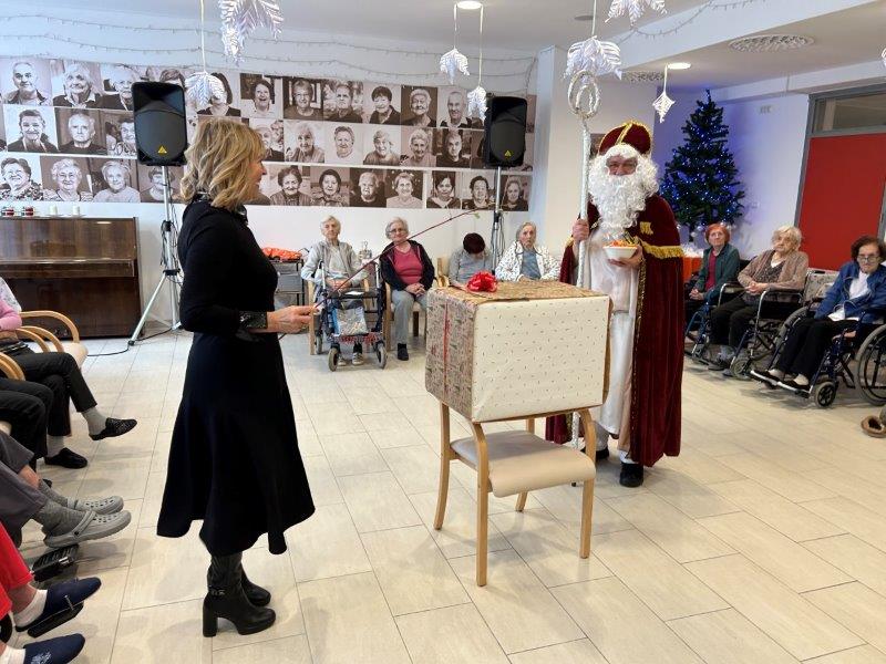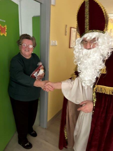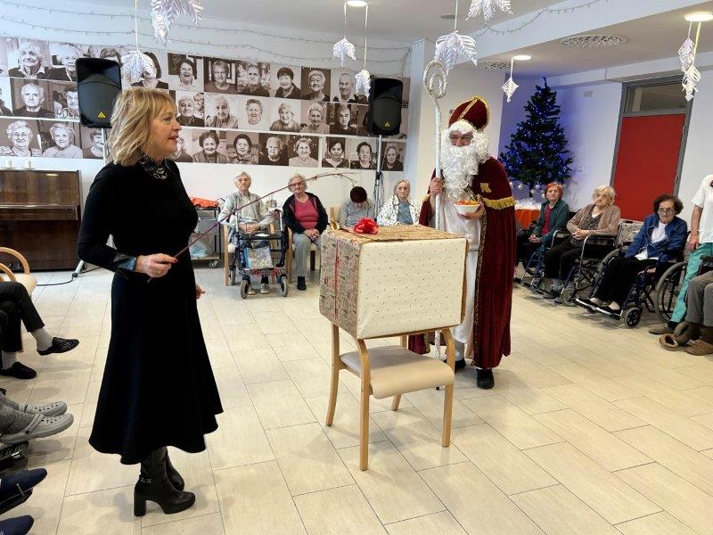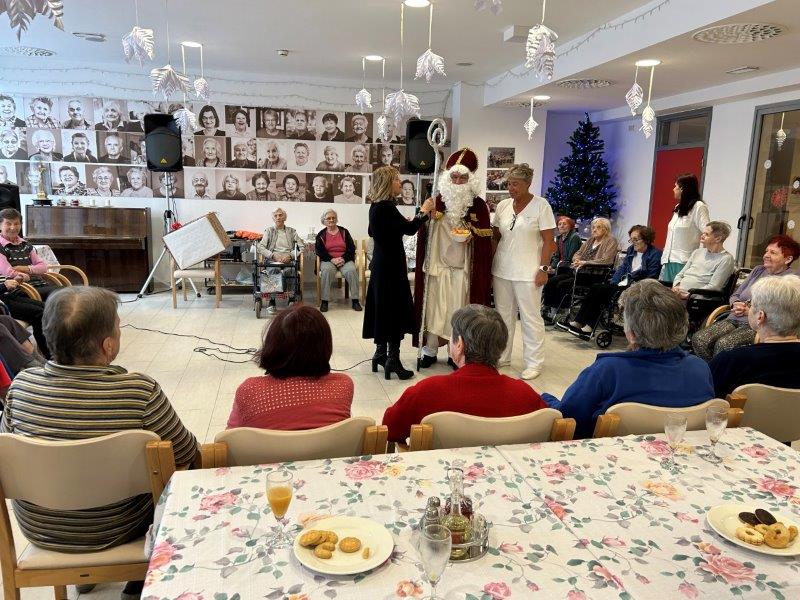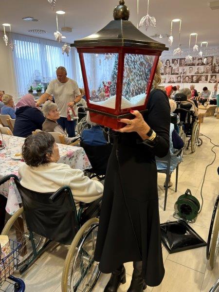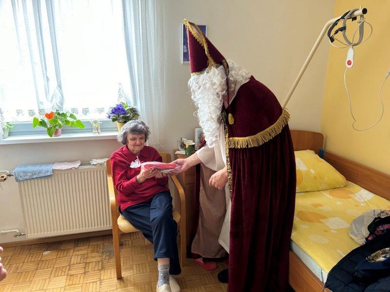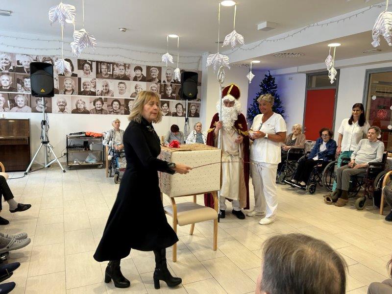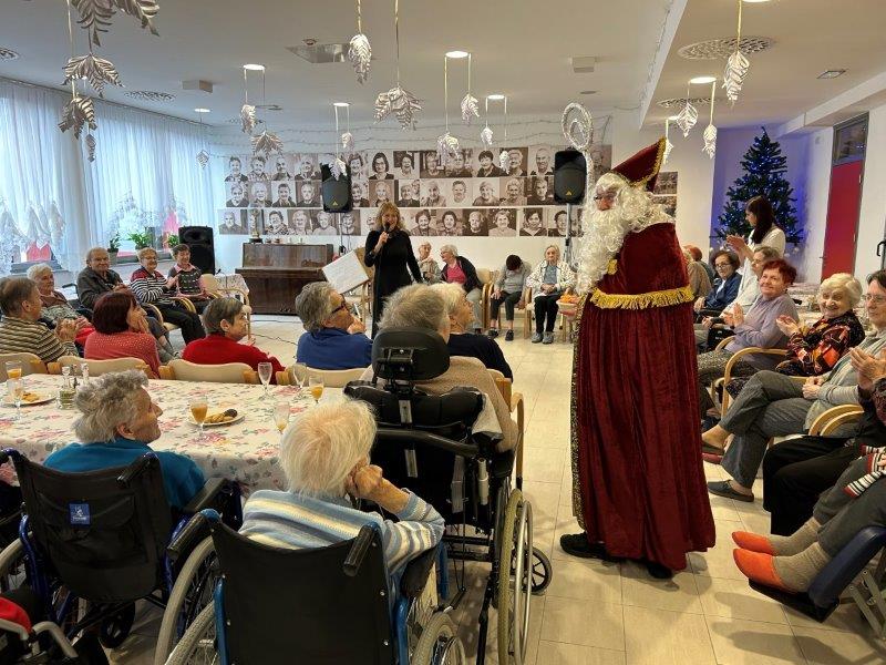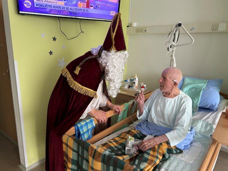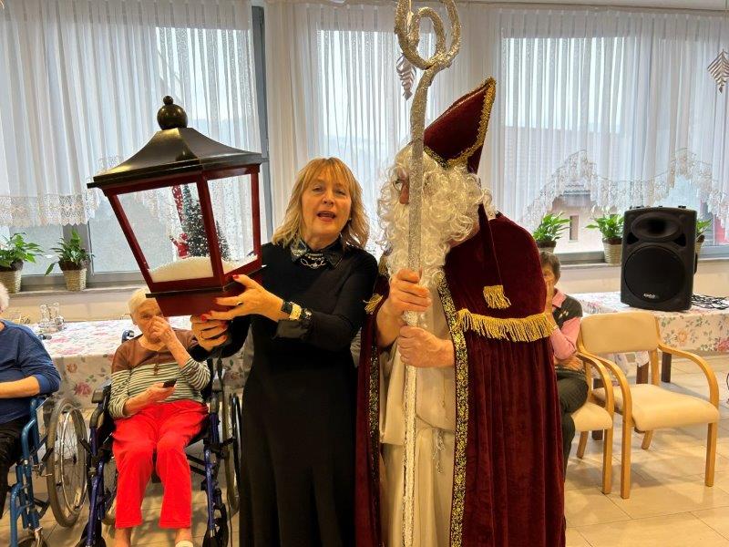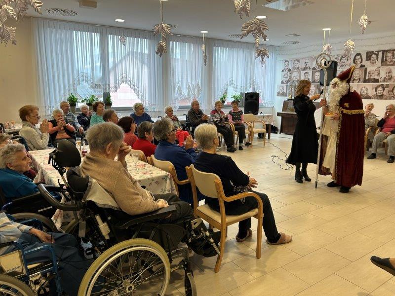 Hladno jutro nam je polepšal prihod sv. Miklavža. Je sveti mož, eden od treh, ki nas obišče v mesecu decembru. Nekaj dni pred miklavževanjem smo mu napisali pismo z željami. S seboj je pripeljal tudi pridne angelčke, ti so stanovalcem razdelili Miklavževa darila, med drugimi tudi svetilko s padajočim snegom.