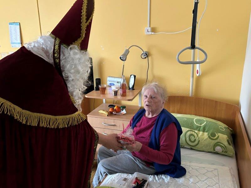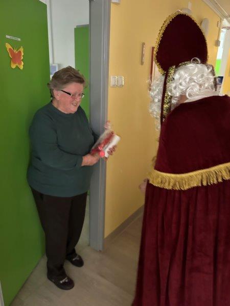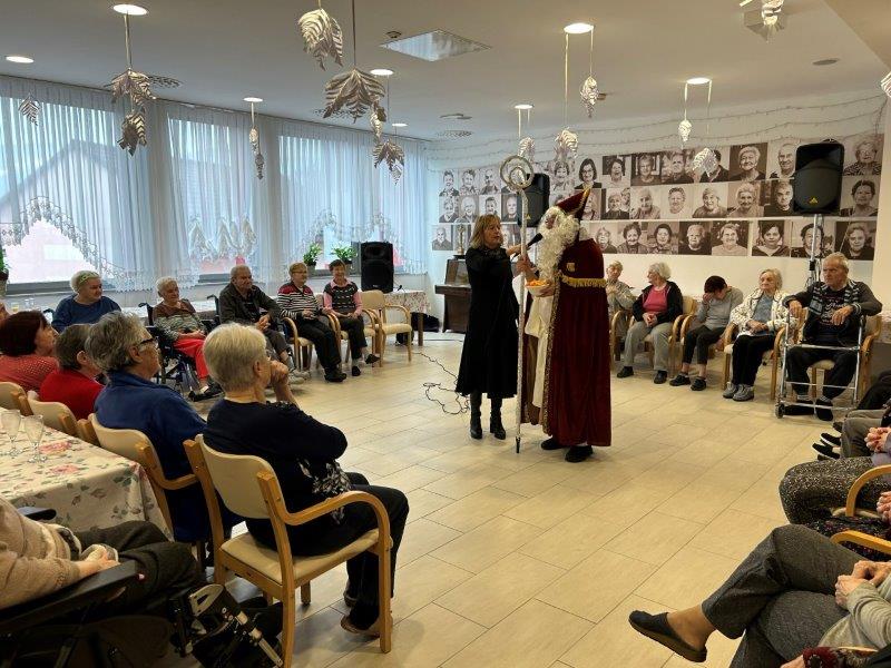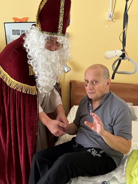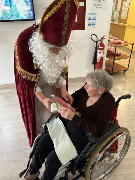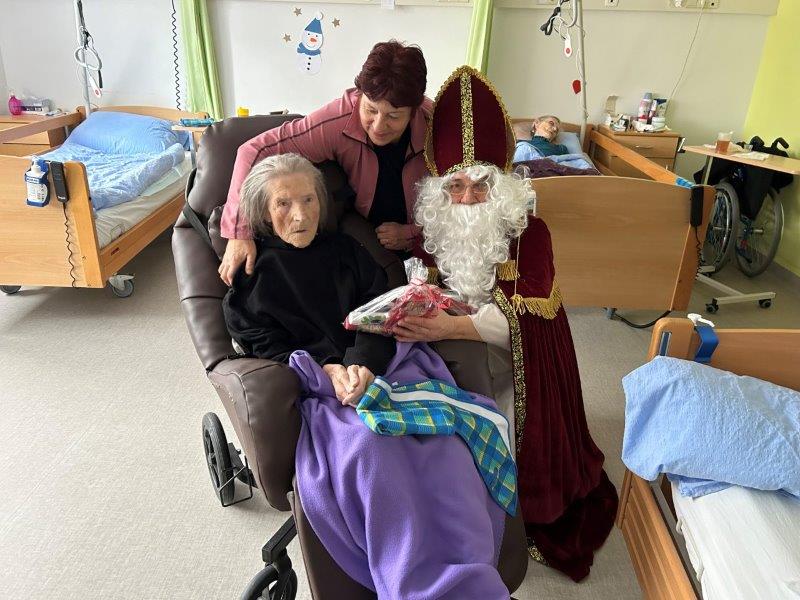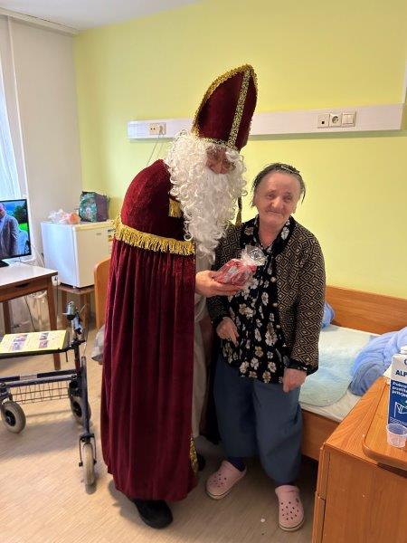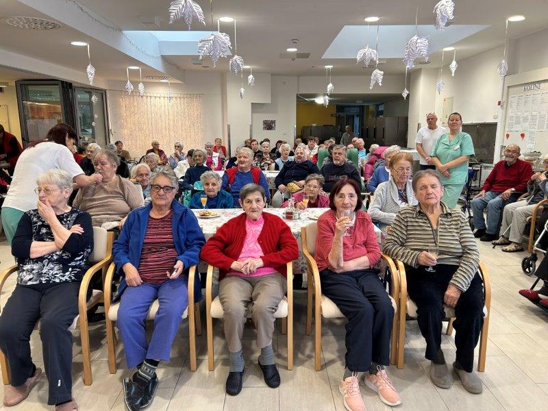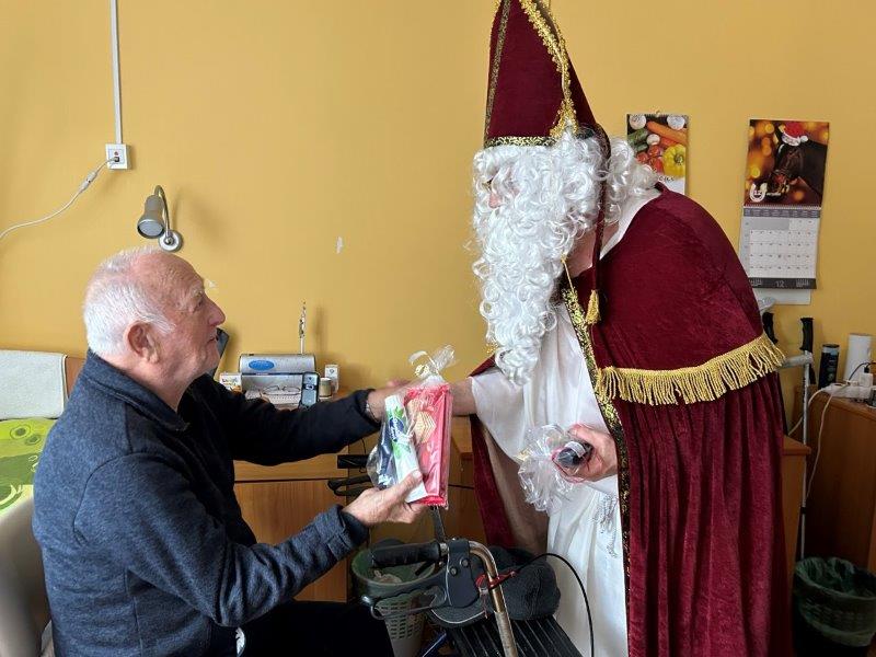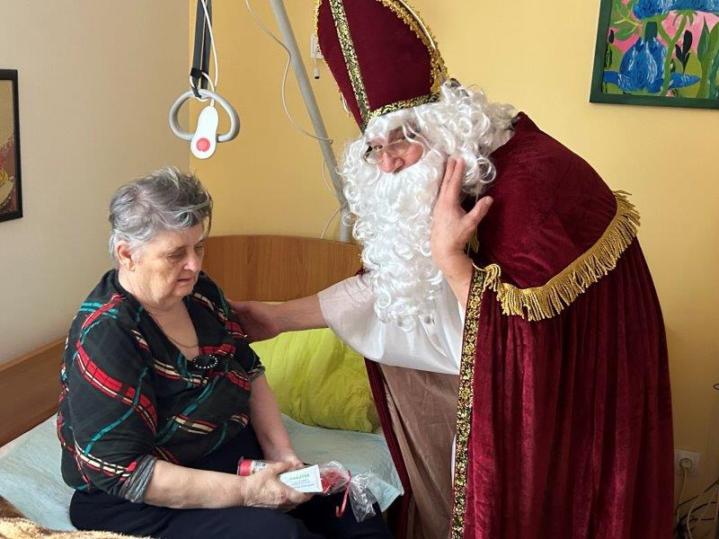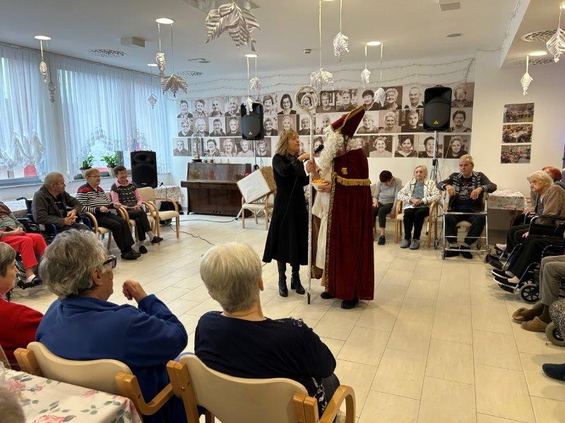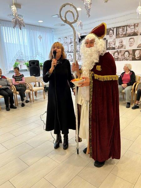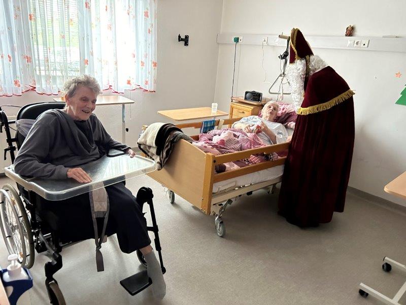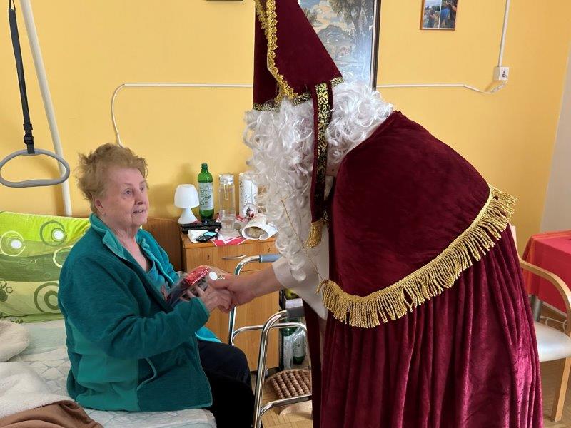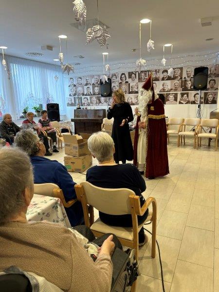 Hladno jutro nam je polepšal prihod sv. Miklavža. Je sveti mož, eden od treh, ki nas obišče v mesecu decembru. Nekaj dni pred miklavževanjem smo mu napisali pismo z željami. S seboj je pripeljal tudi pridne angelčke, ti so stanovalcem razdelili Miklavževa darila, med drugimi tudi svetilko s padajočim snegom.