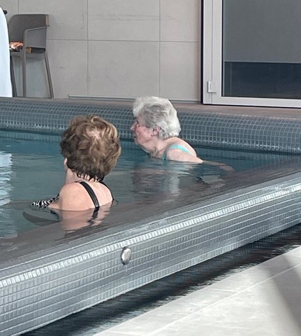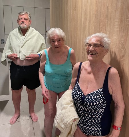 Danes smo se s stanovalci, ki so samostojno pomični in sposobni samostojnega vstopa v bazen, odpravili na kopanje v Zdravilišče Laško. Že dalj časa so izražali željo, da bi šli v bazen, zato smo jim to omogočili. Najprej so se razgibali ob vodeni vadbi v vodi, zaplavali in za konec še zmasirali na masažnih šobah. Veliko bolj gibčni in zadovoljni smo se vrnili v Dom z željo, da se taka rekreacija čim prej ponovi.