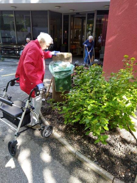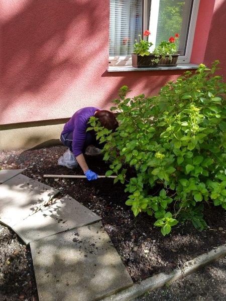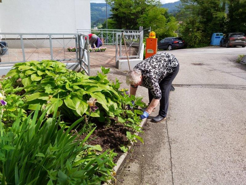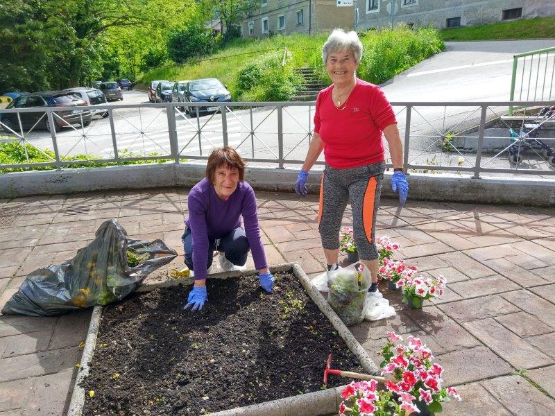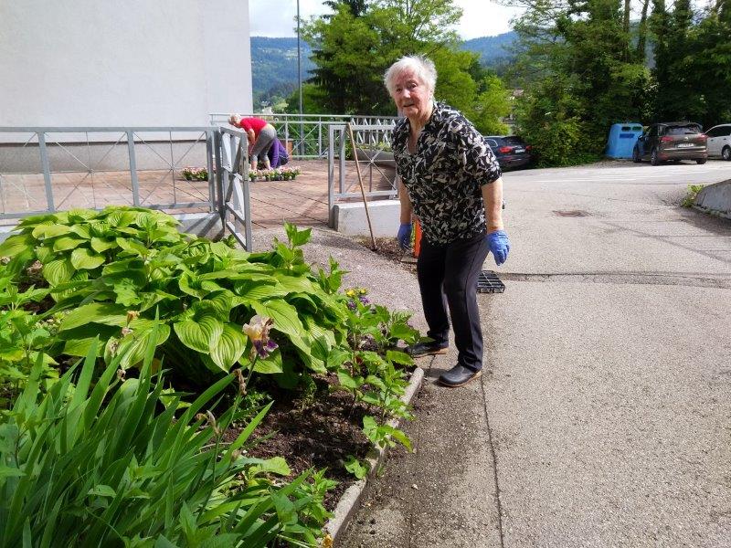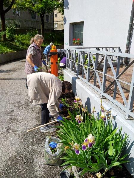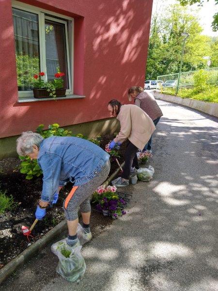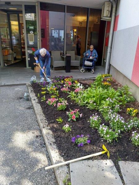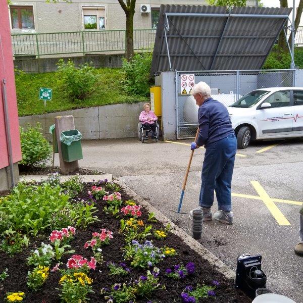 Dopoldne je sonce sijalo ravno dovolj dolgo, da smo posadili rože še na gredico pred domom. Ekipa naših dragih “vrtnark” je kot bi mignil oplela in zasadila gredice. Takoj za tem se je nekaterim že mudilo na pevsko vajo, drugim na fizioterapijo, nekateri pa so še malo posedeli na sončku.