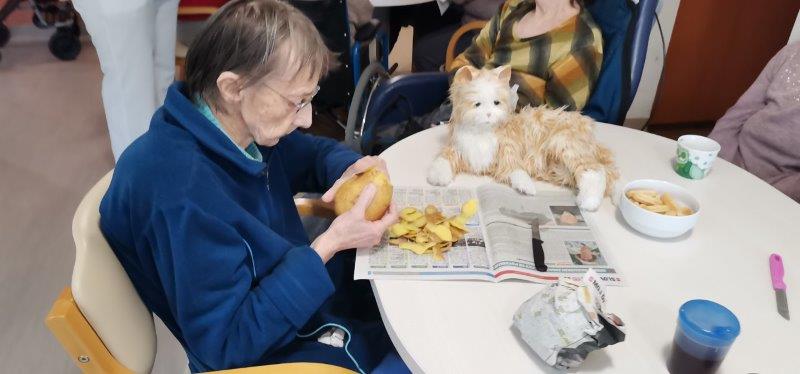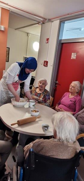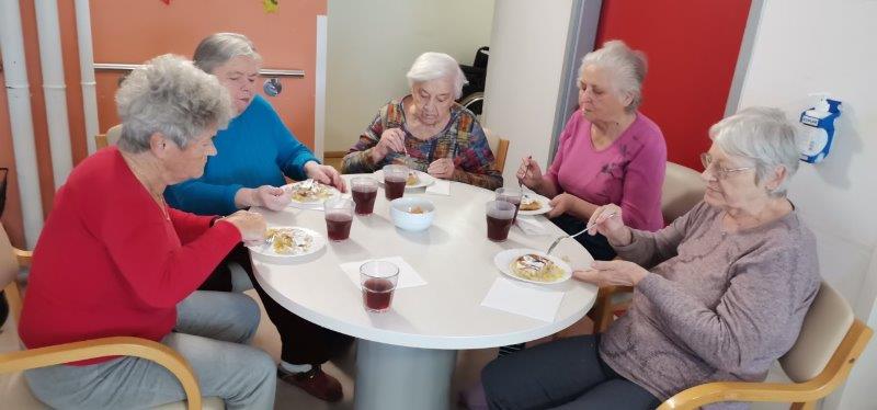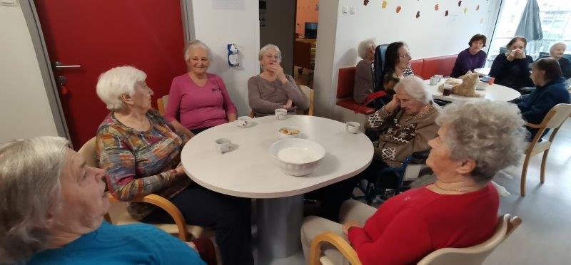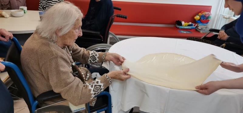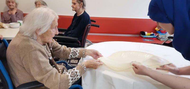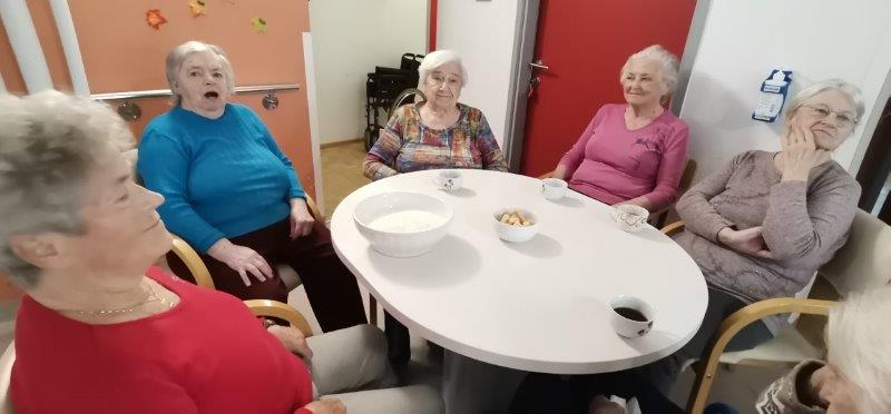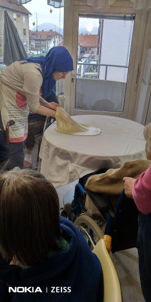 Ob čemernih meglenih dnevih naše zaposlene poskrbijo, da je v domu prijetno in toplo vzdušje. Tako so v gospodinjski skupini Kofetaric pripravljali Krompirjevo pito. Stanovalke so pridno lupile, rezale in pomagale razvleči testo, po nadstropju pa je prijetno dišalo. Pita je bila res slastna!