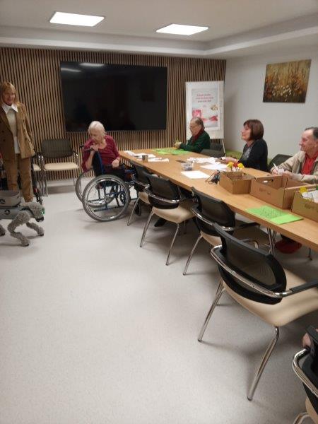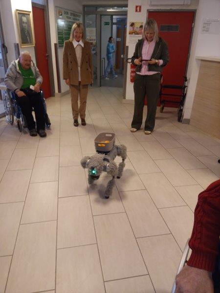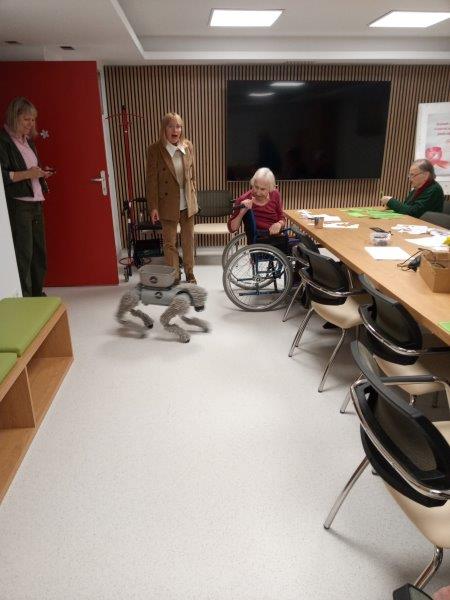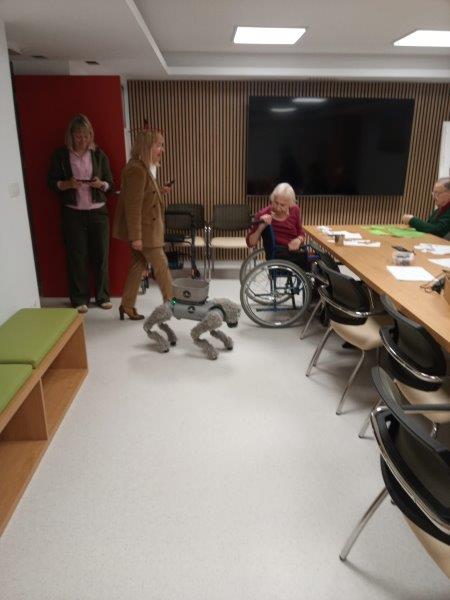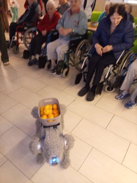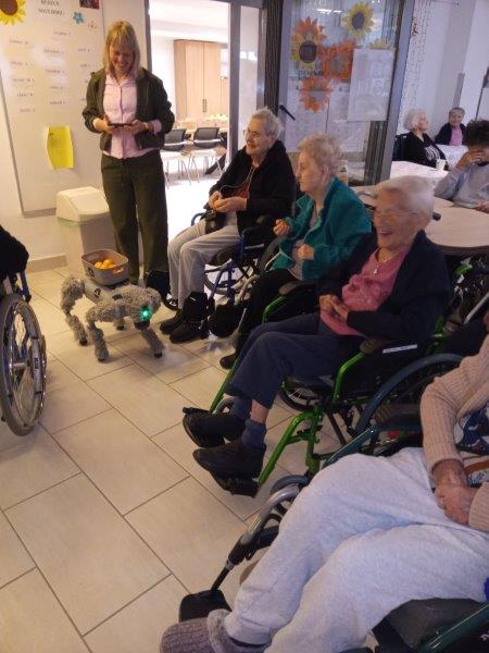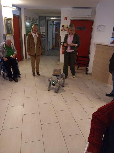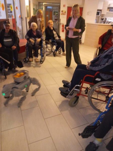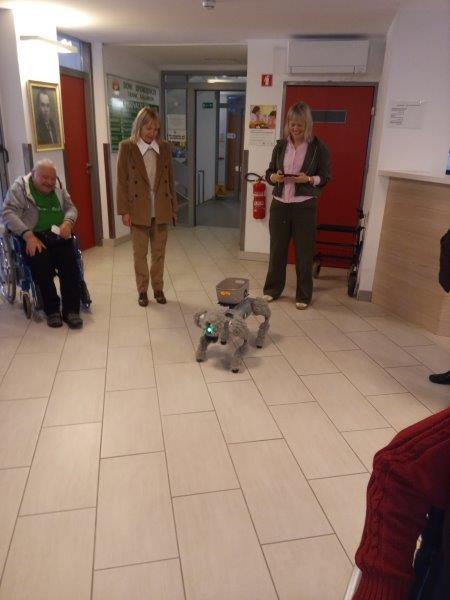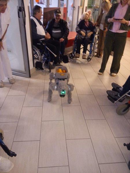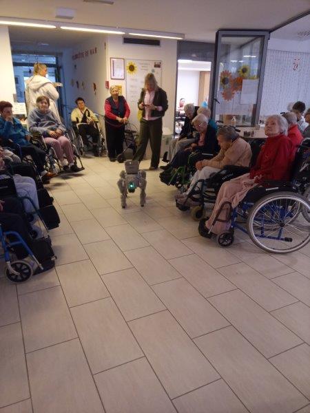 Obiskala sta nas robotski pes Moby in njegova “mama” dr. Maša Jazbec. Prinesla sta nam mandarine in veliko dobre volje, zanimivih in zabavnih trenutkov, saj smo se takoj strinjali, da bi Mobya z veseljem posvojili. Ne potrebuje svojega pesjaka, niti sprehodov, živi samo od elektrike, stanovalci pa se ob njem odlično počutijo. Ker ne laja, se ga nihče ni ustrašil, zna prinašat stvari, poskakovat, lahko smo ga tudi pobožali. Veseli bomo. Če nas bosta z Mašo še kdaj obiskala!