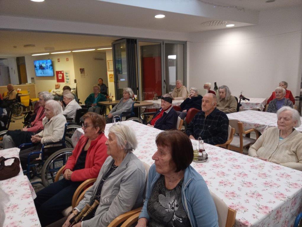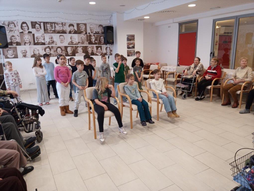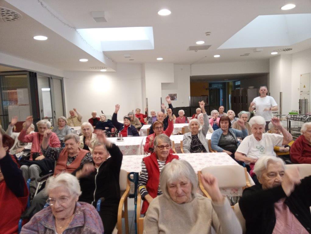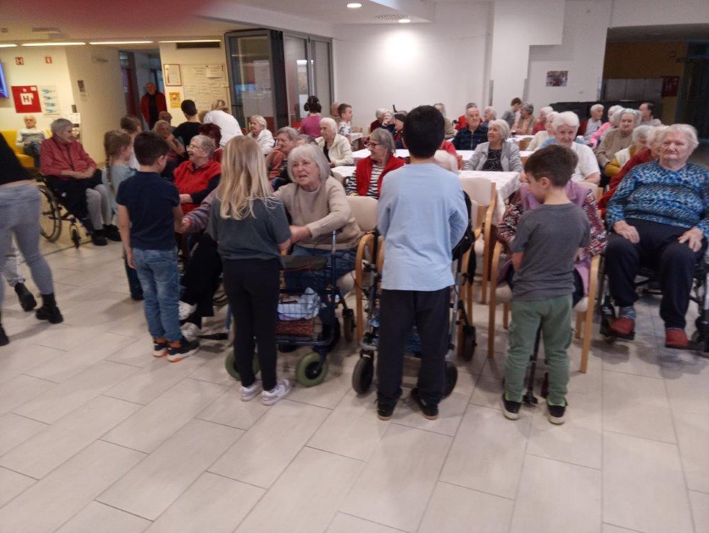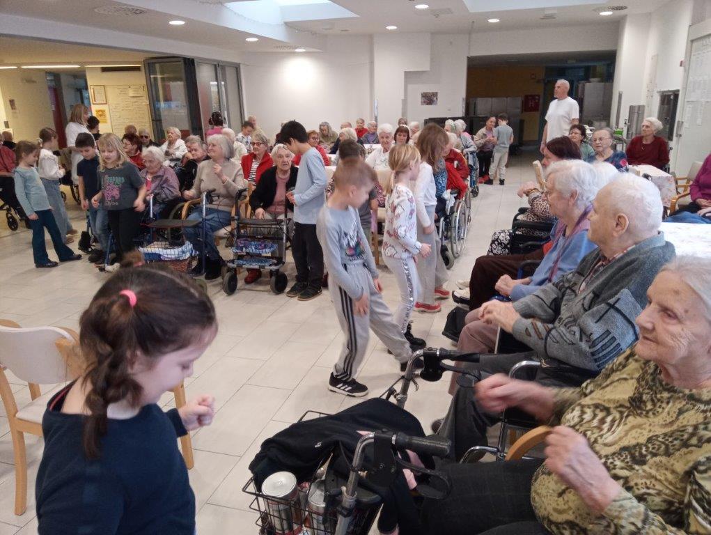 Otroci osnovne šole so se predstavili s telovadno-plesnim programom, s katerim so razveselili prisotne. S svojim živahnim  nastopom so napolnili prostor z energijo in dobro voljo. K plesu in gibanju so povabili tudi stanovalce, ki so se z veseljem pridružili. Skupaj so migali, se smejali in dokazali, da gibanje povezuje vse generacije.
