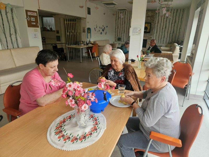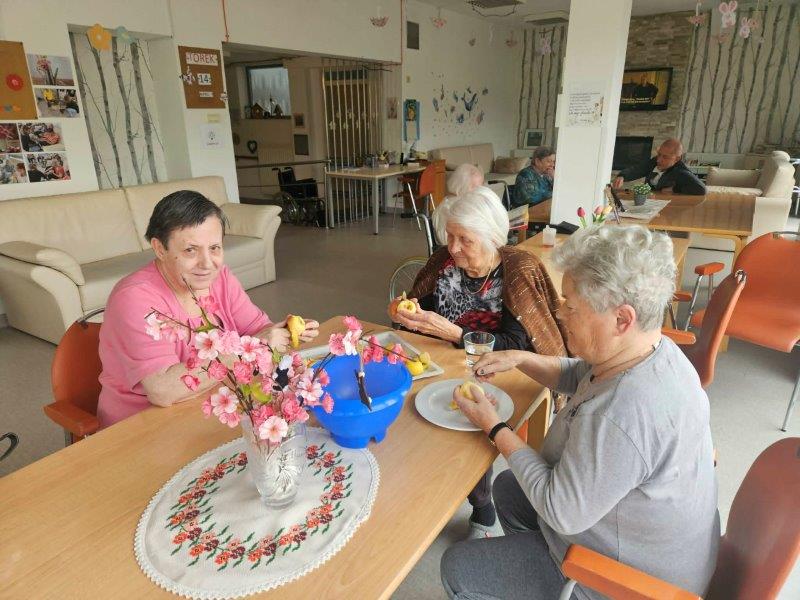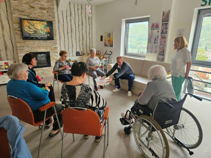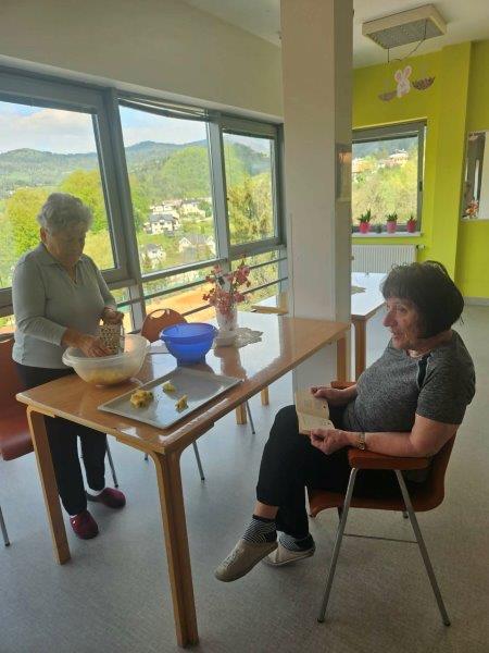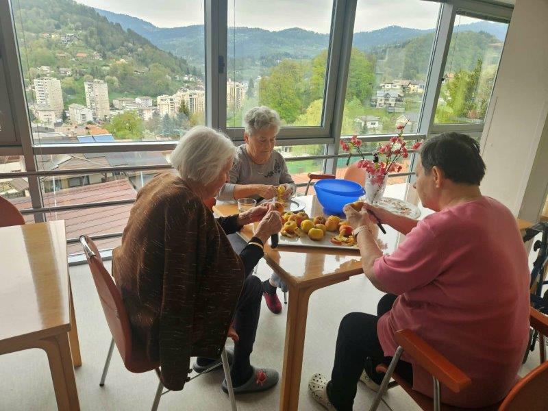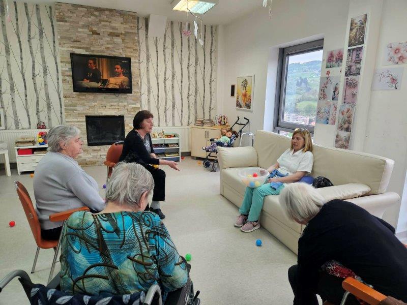 Medtem ko se je štrudelj pridno pekel v pečici, pa smo čas izkoristili tudi za gibanje in druženje. Skupaj z našimi javnimi delavci so se stanovalke zabavale ob igrah z žogo, kjer ni manjkalo smeha, dobre volje in prijetnega tekmovalnega duha.